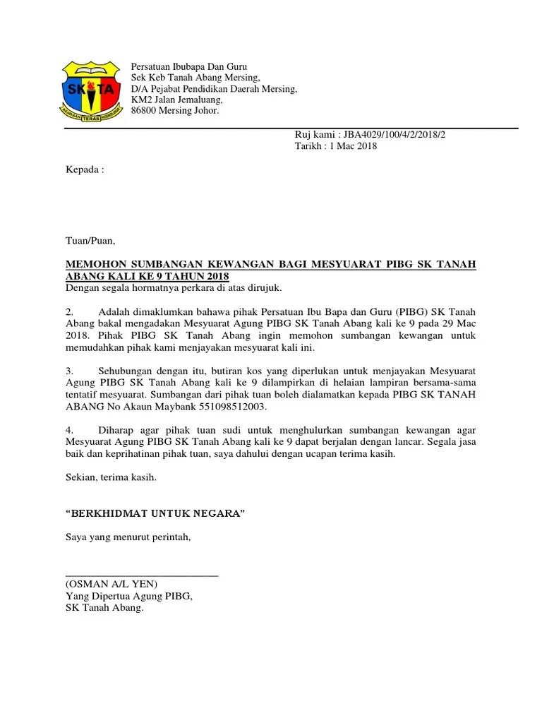 Surat Mohon Sumbangan Kewangan Pibg / Contoh Surat Permohonan Kepada Yang Berhormat Surat 35 Otosection. Surat mohon maaf menolak tawaran latihan industri xiao doubles. Contoh surat memohon sumbangan pibg tuan, memohon sumbangan membeli karpet di pusat akses sekolah merujuk kepada perkara di atas, 2. Contoh surat rasmi memohon sumbangan kewangan surat rasmi mohon peruntukan dan sumbangan pada 1 4 2016 jumlah. Oleh itu, pihak sekolah ingin memohon agar pihak persatuan ibu bapa dan guru (pibg) smk bugaya dapat memberikan sumbangan kewangan sebanyak rm 1500.00 demi Siti nadiah binti nuwawi,guru kelas 1 teknologi kimpalan,kolej vokasional tanjung puteri,johor bahru,johor.